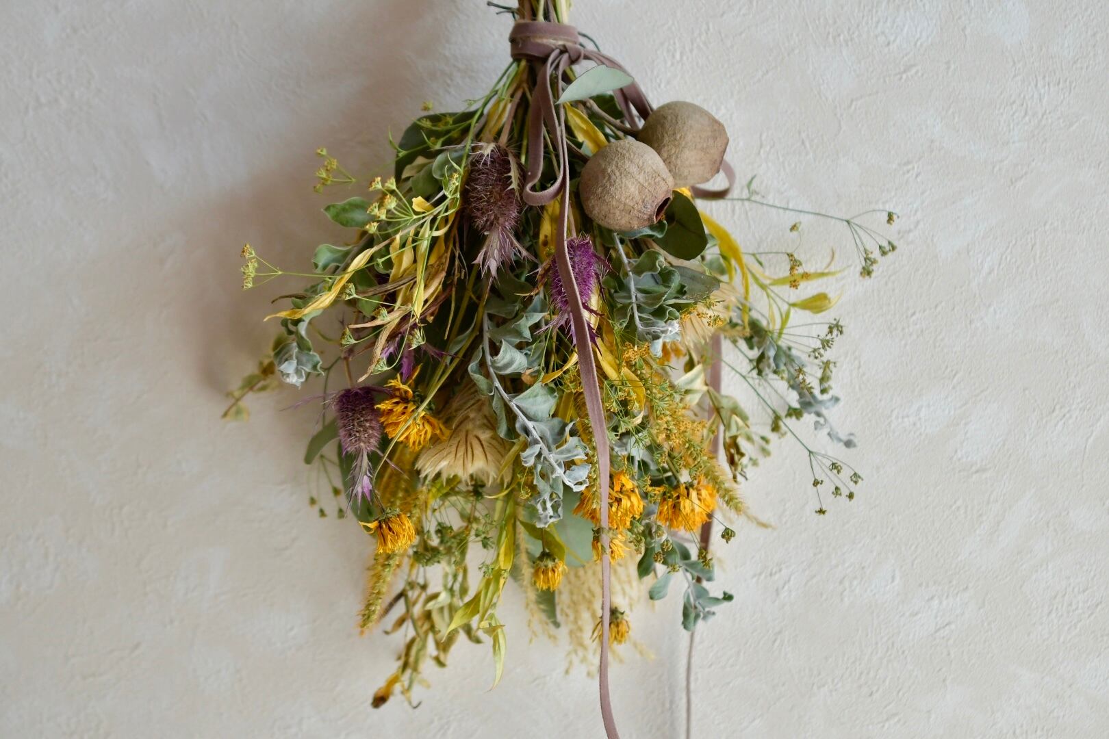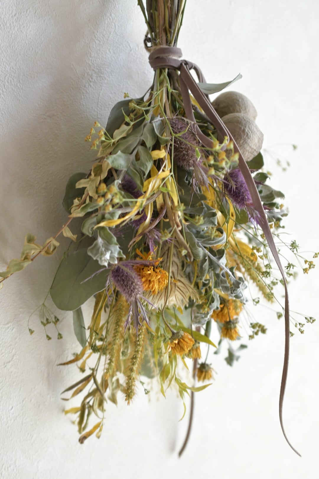 丁字草・ミシマサイコ・姫ひまわり・金狗尾など、温かな黄色の草花を集めて束ねた小さめのスワッグです。