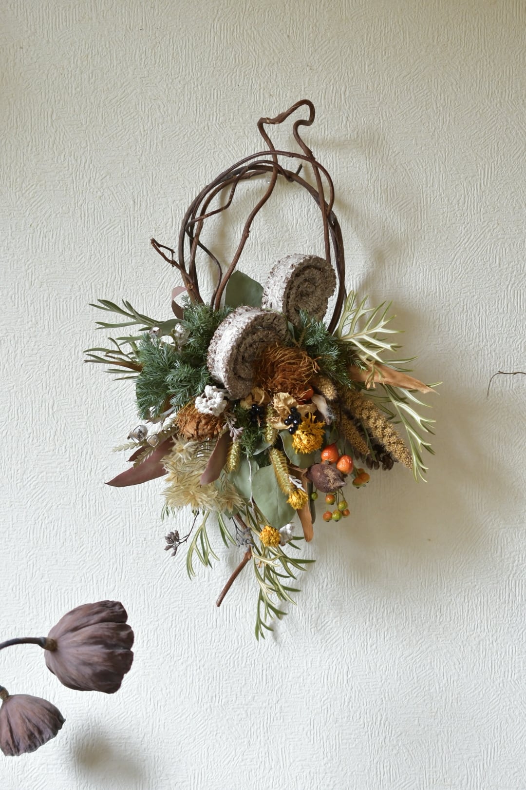 ◎自然素材を使用して制作していますので、経年褪色します。高温多湿、直射日光を避けて飾っていただくと少し長くお楽しみいただけますが、変わっていく色もお楽しみいただけたら嬉しいです。