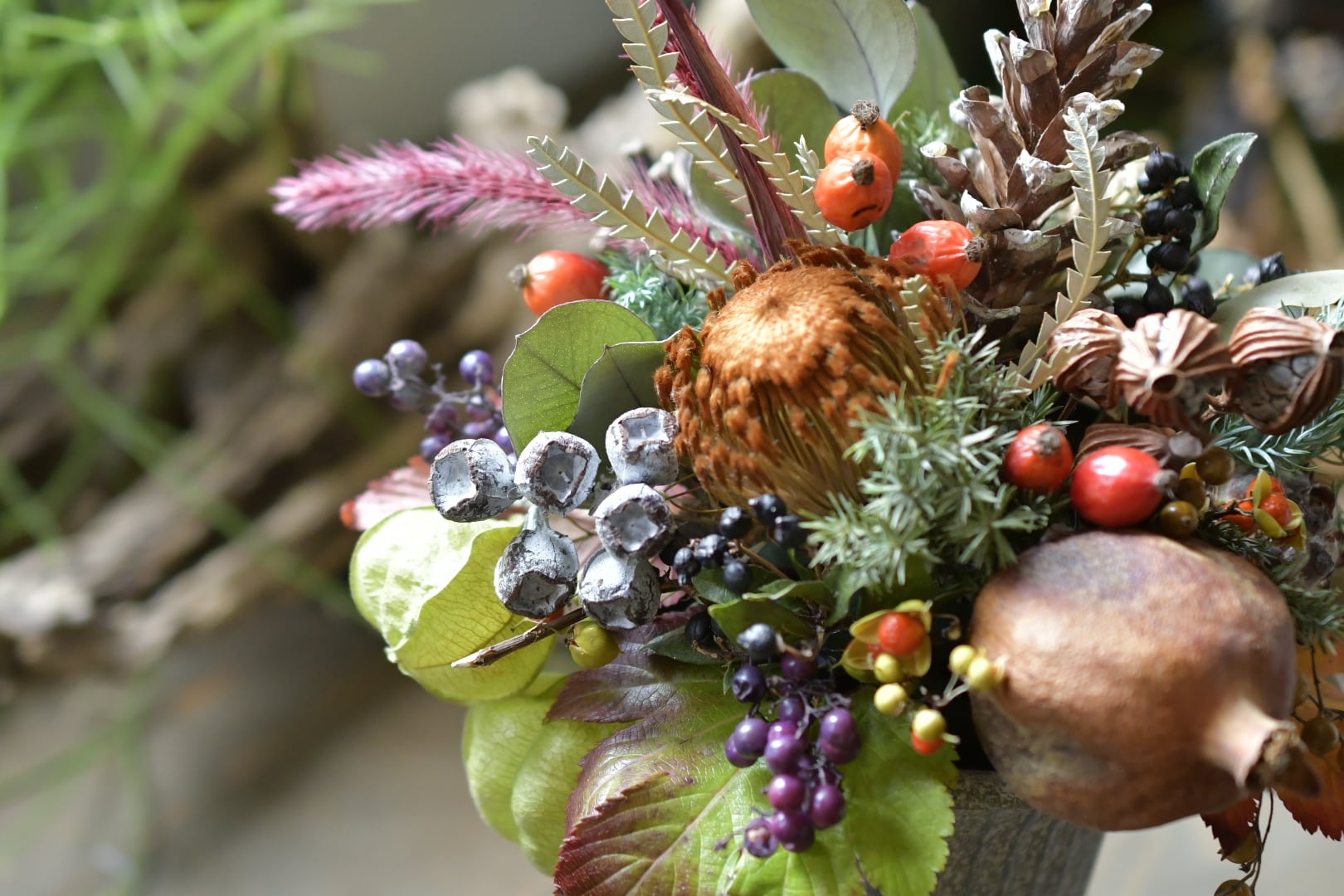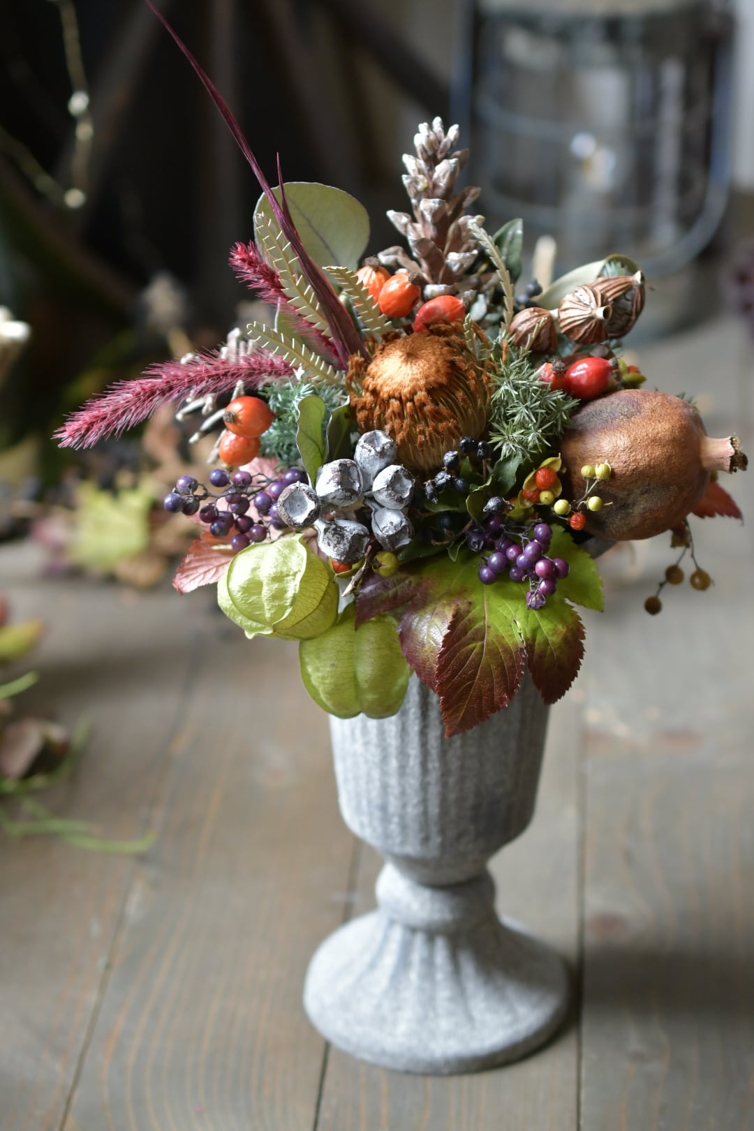 ブリキのゴブレットに、秋の実や花をぎゅっと詰めました。