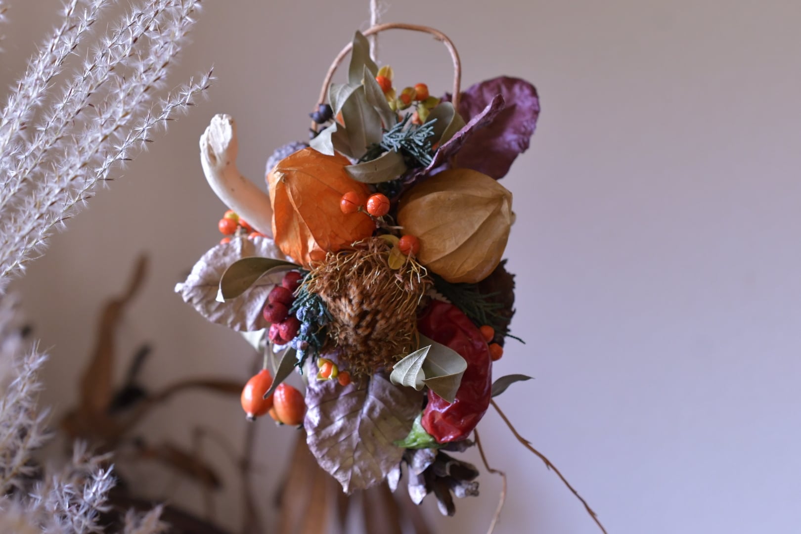 木の実や草の実、秋色の葉っぱなどをたくさん集めて組み合わせました。上から吊るすタイプの飾りです。