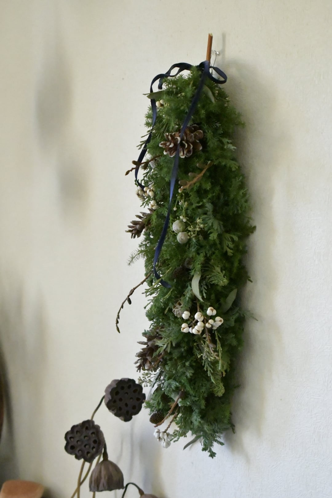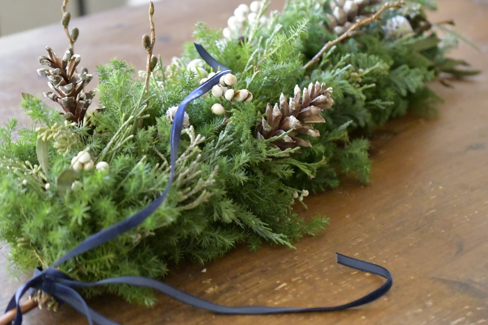 針葉樹と枝葉や木の実で紡いだ細長いガーランドスワッグです。壁にかけるのはもちろん、テーブルセンターとして飾っていただくのも素敵です。