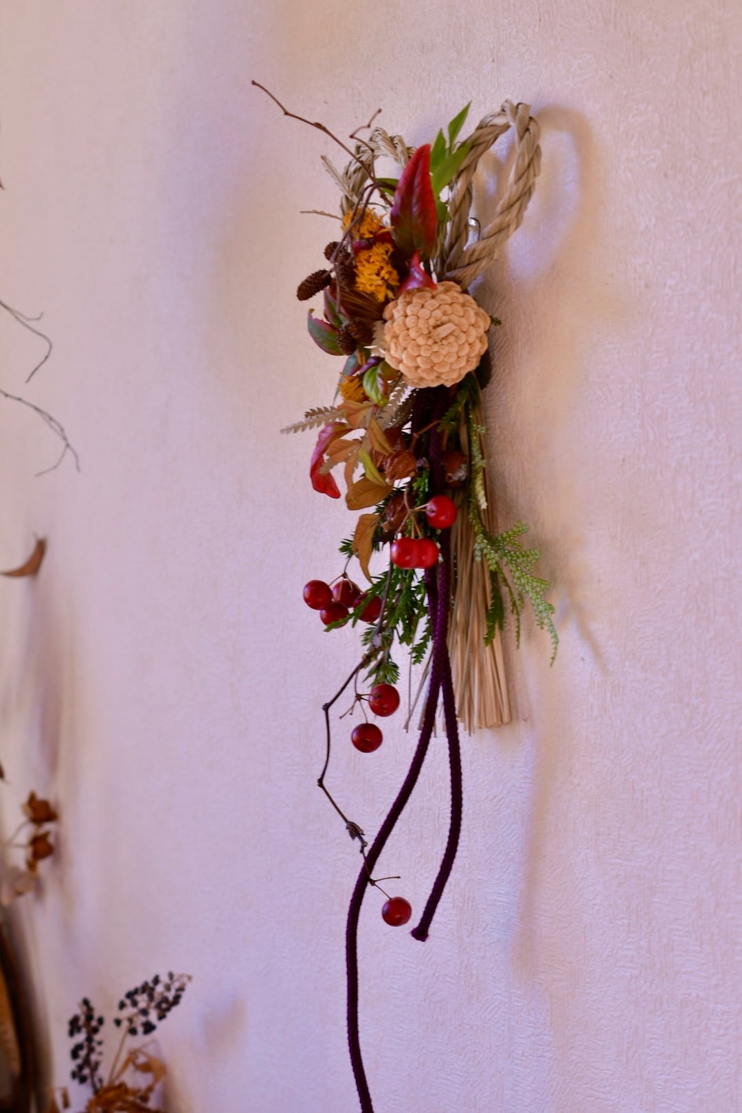 細目のしめ縄にサンキライの実とドライフラワーを合わせた、縦型のお正月飾りです。