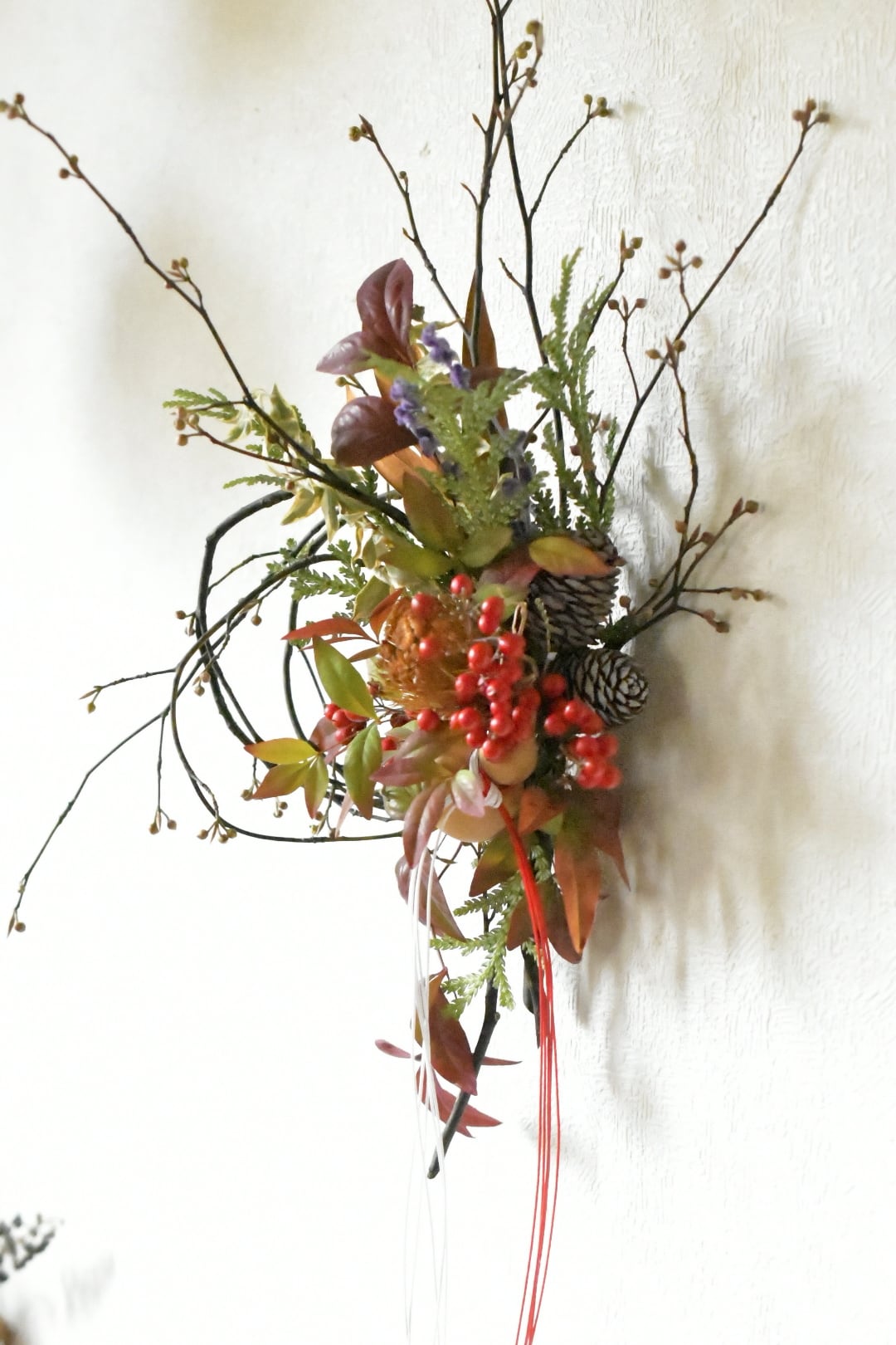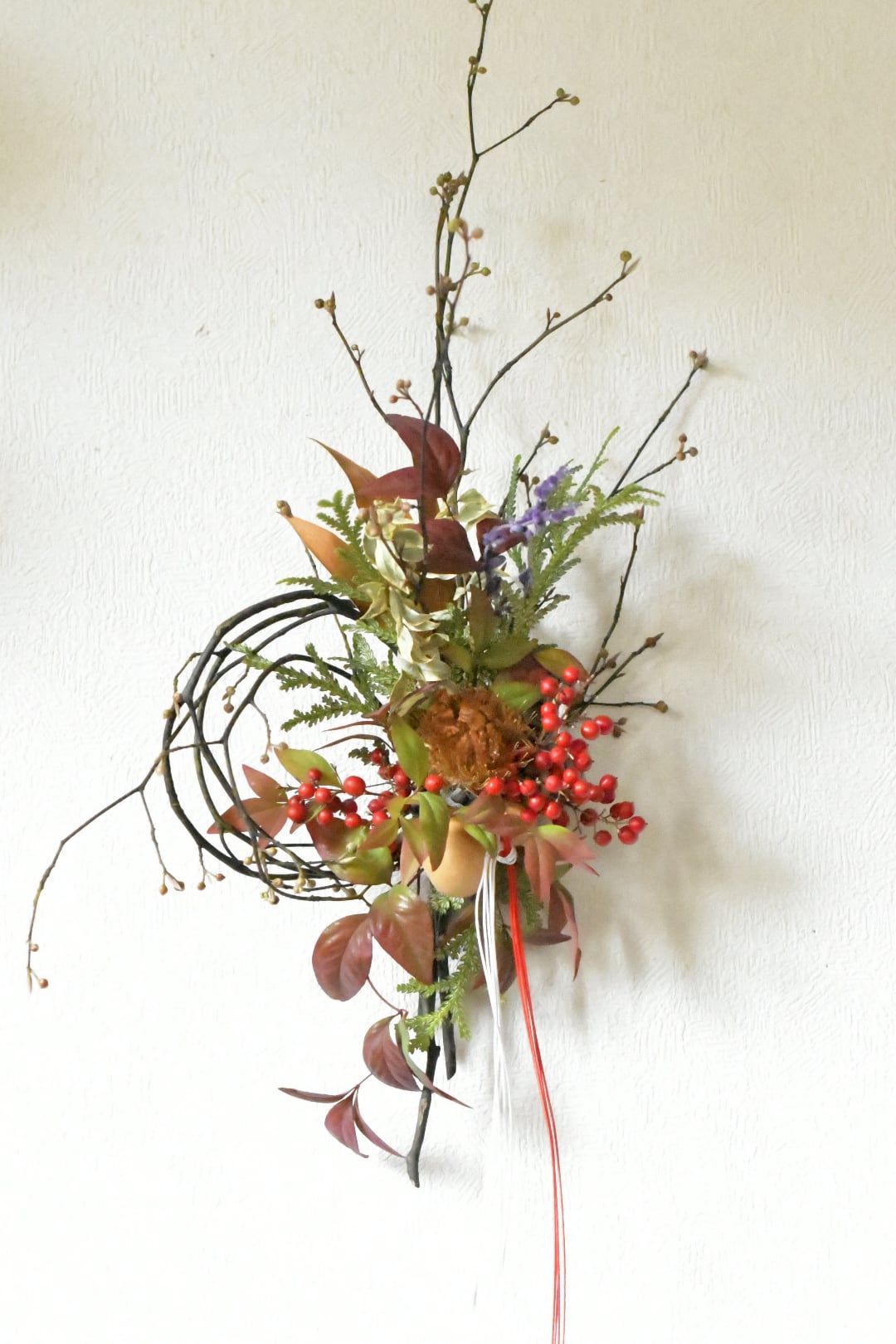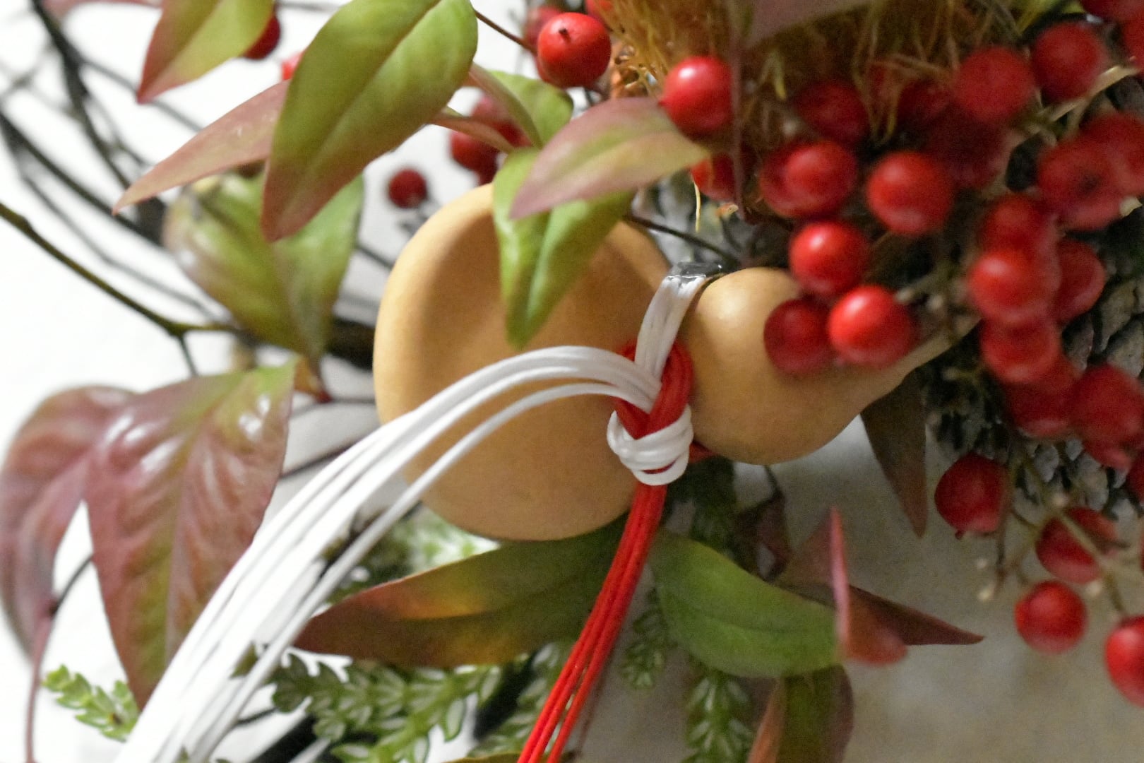 クロモジの枝をベースに、南天や瓢箪などを合わせたお正月飾りです。