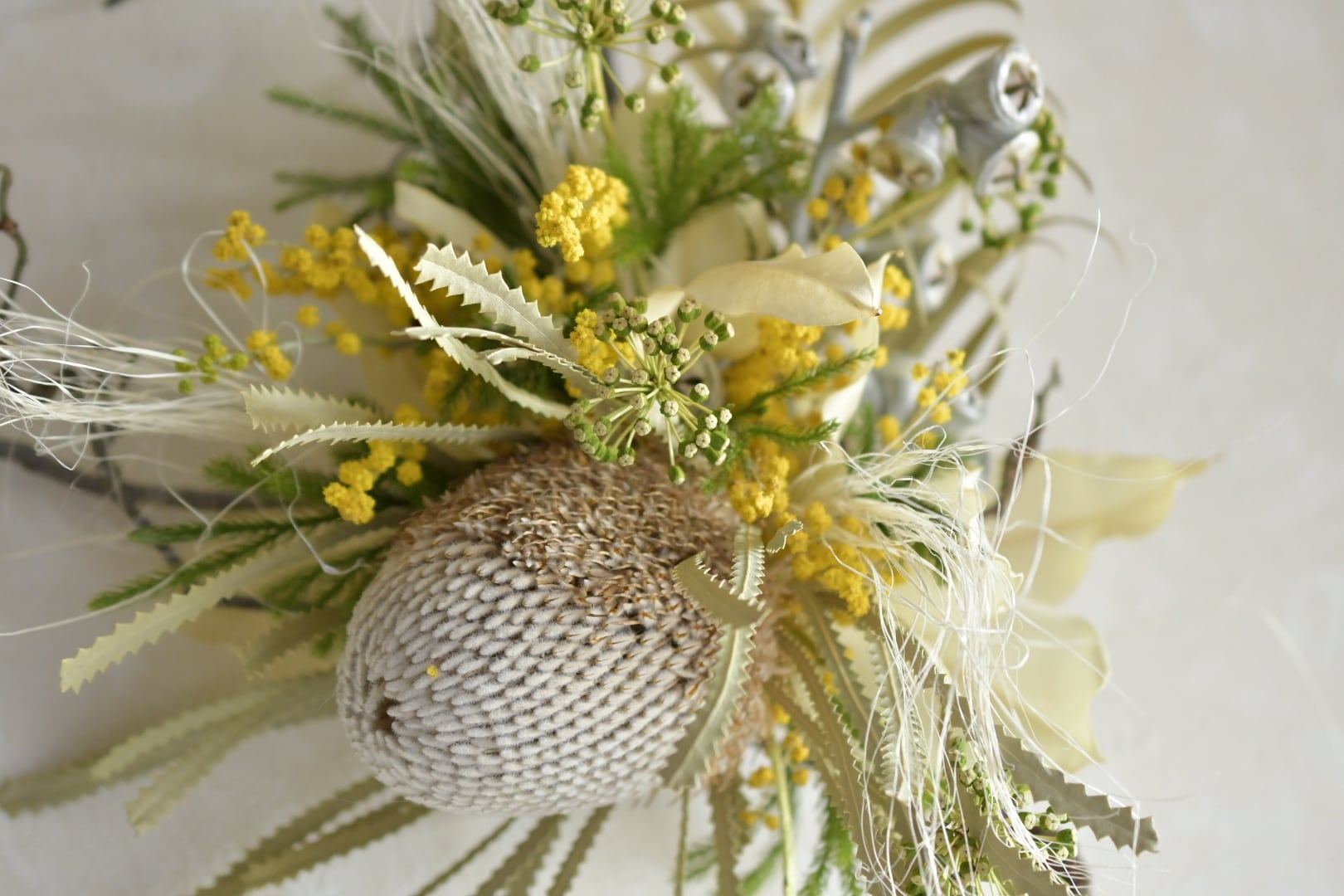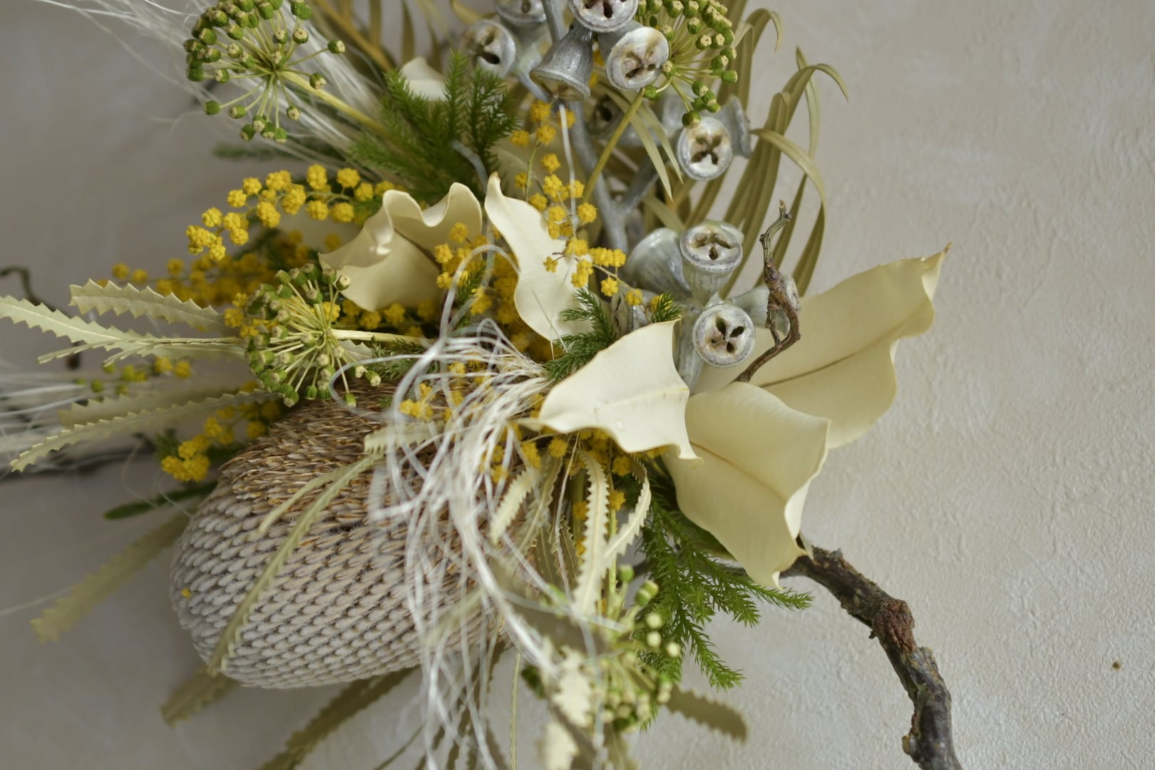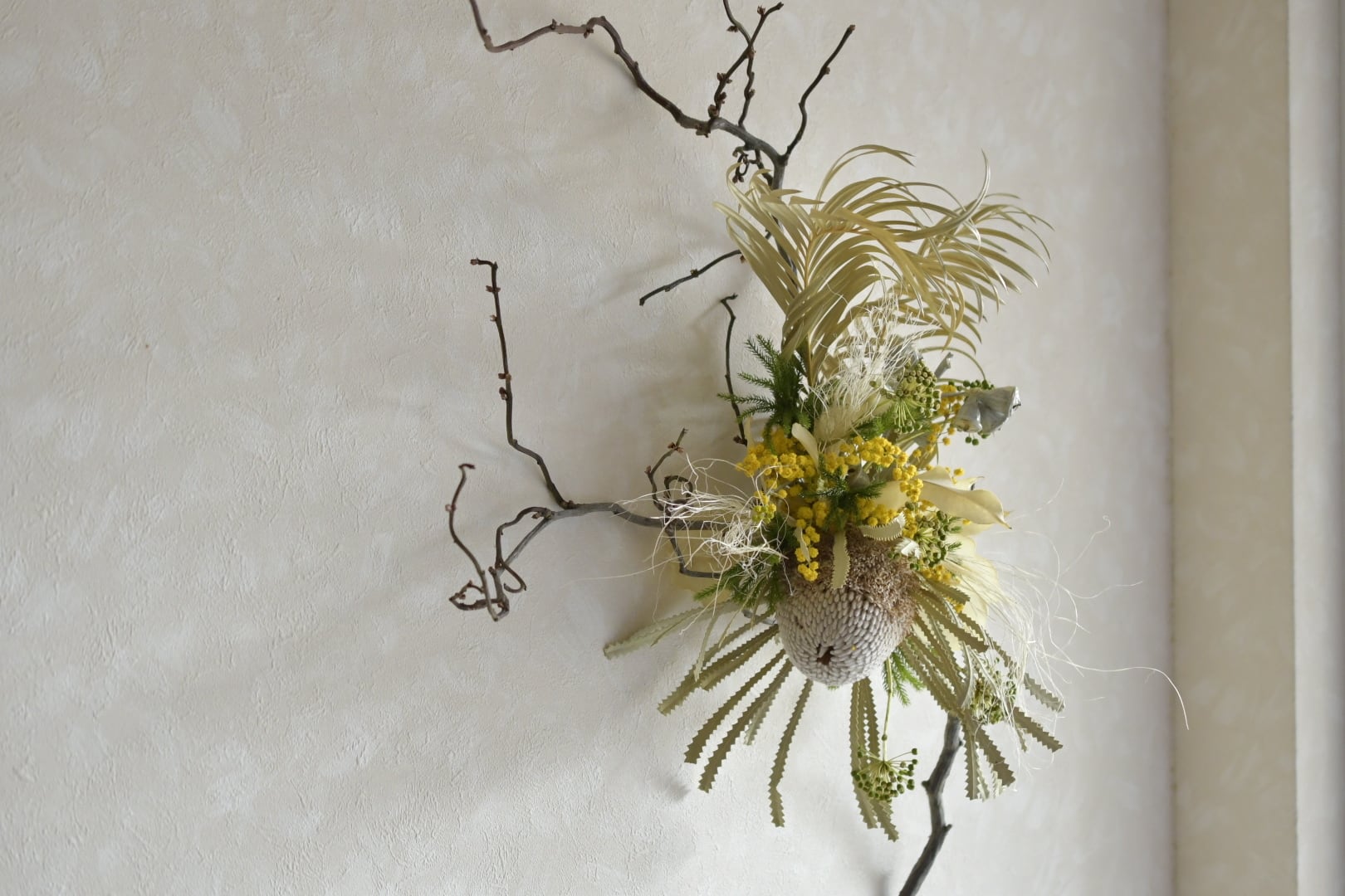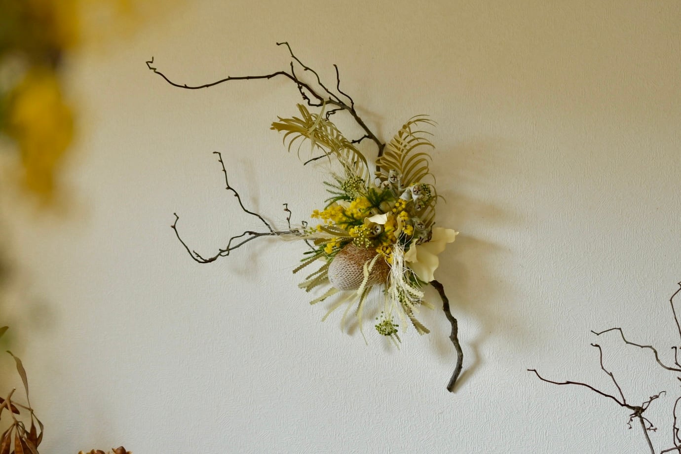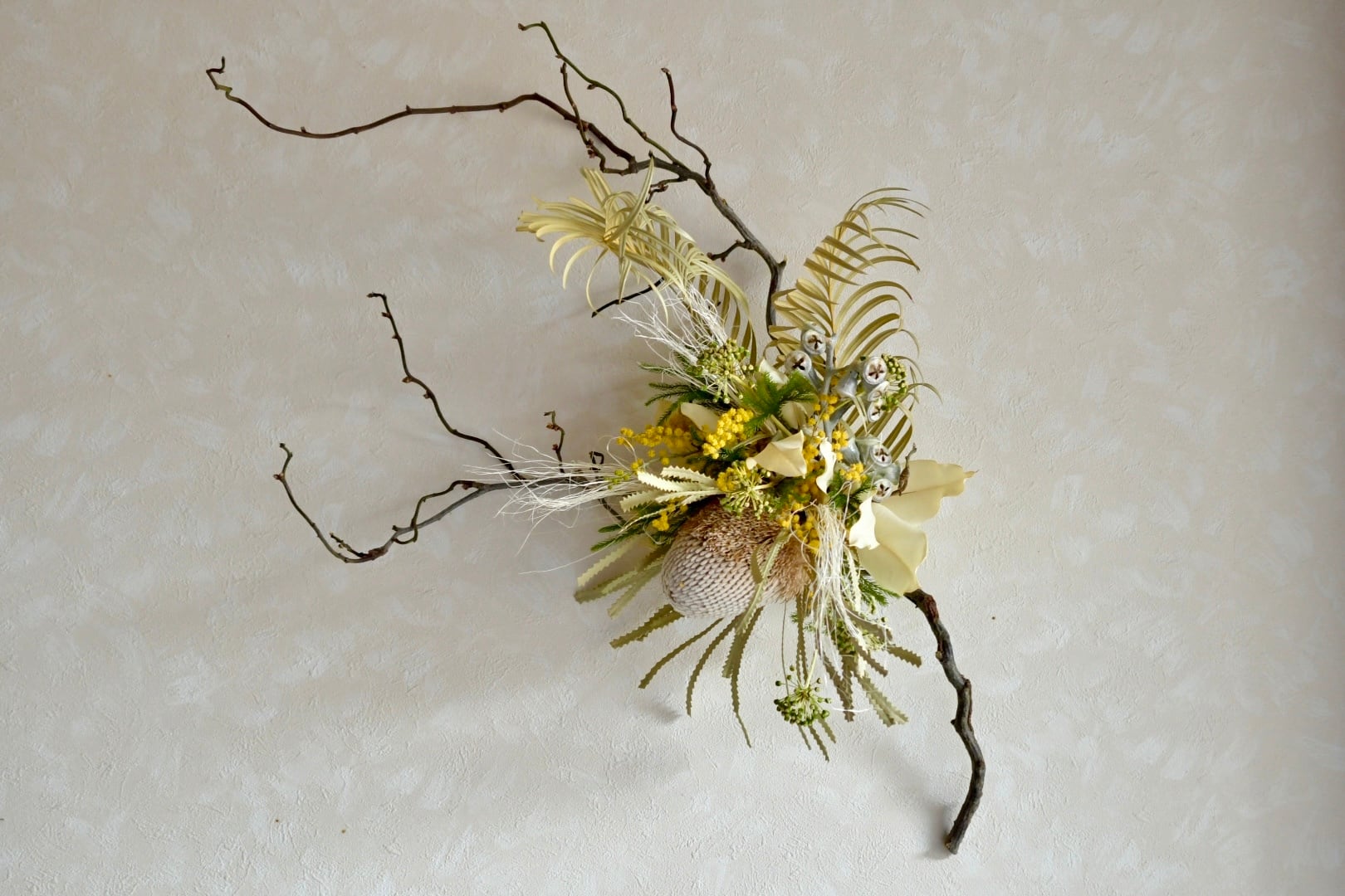 動きのある雲竜梅の枝に、バンクシアやユーカリの実とミモザを合わせた壁飾りです。