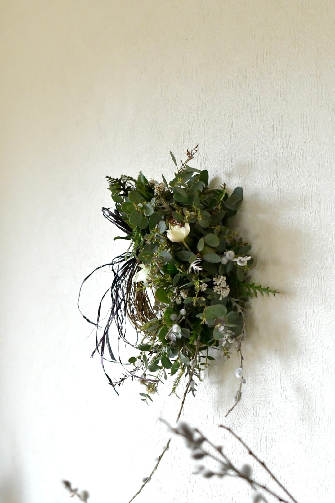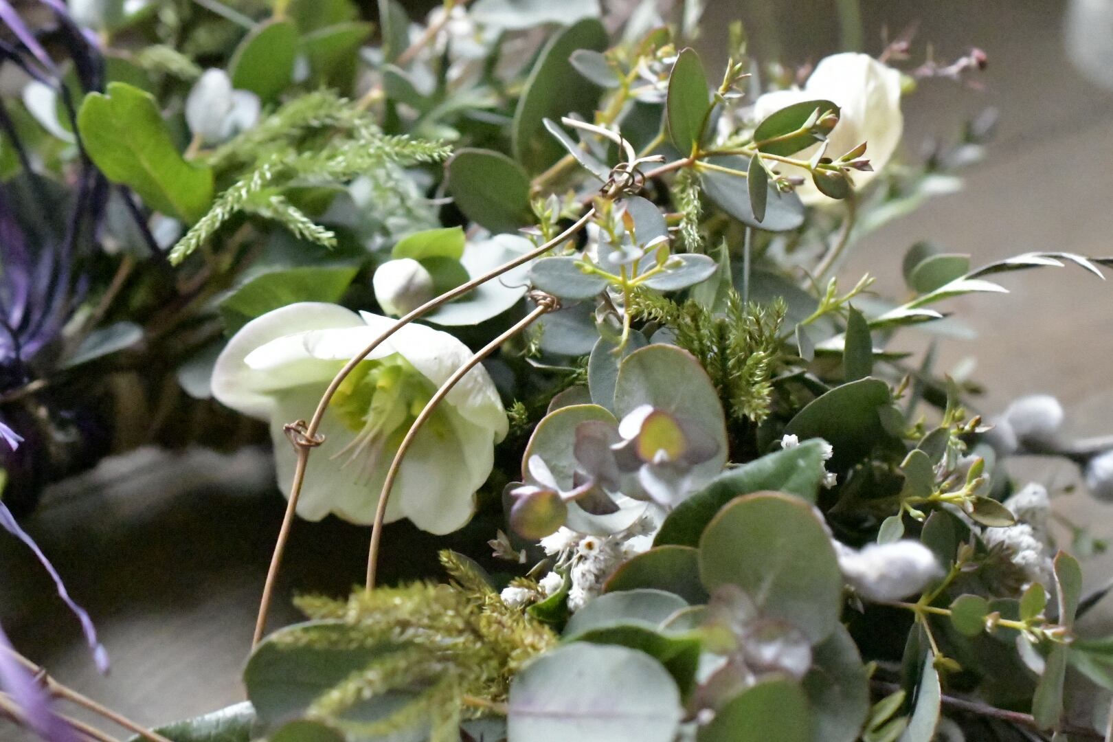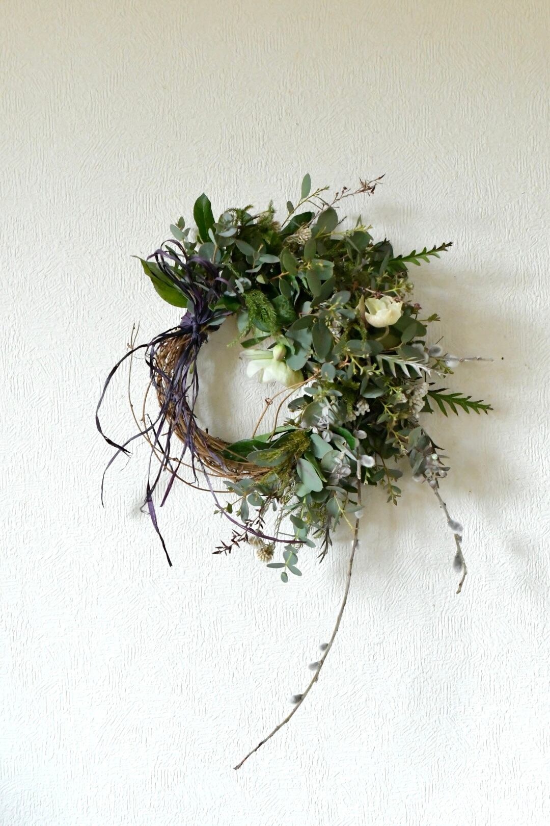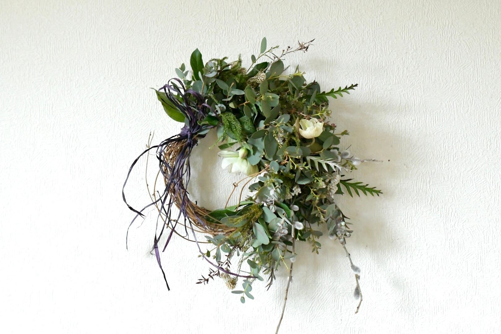 ユーカリやシダなど、数種類のグリーンと白の小花や枝を紡いだハーフリースです。