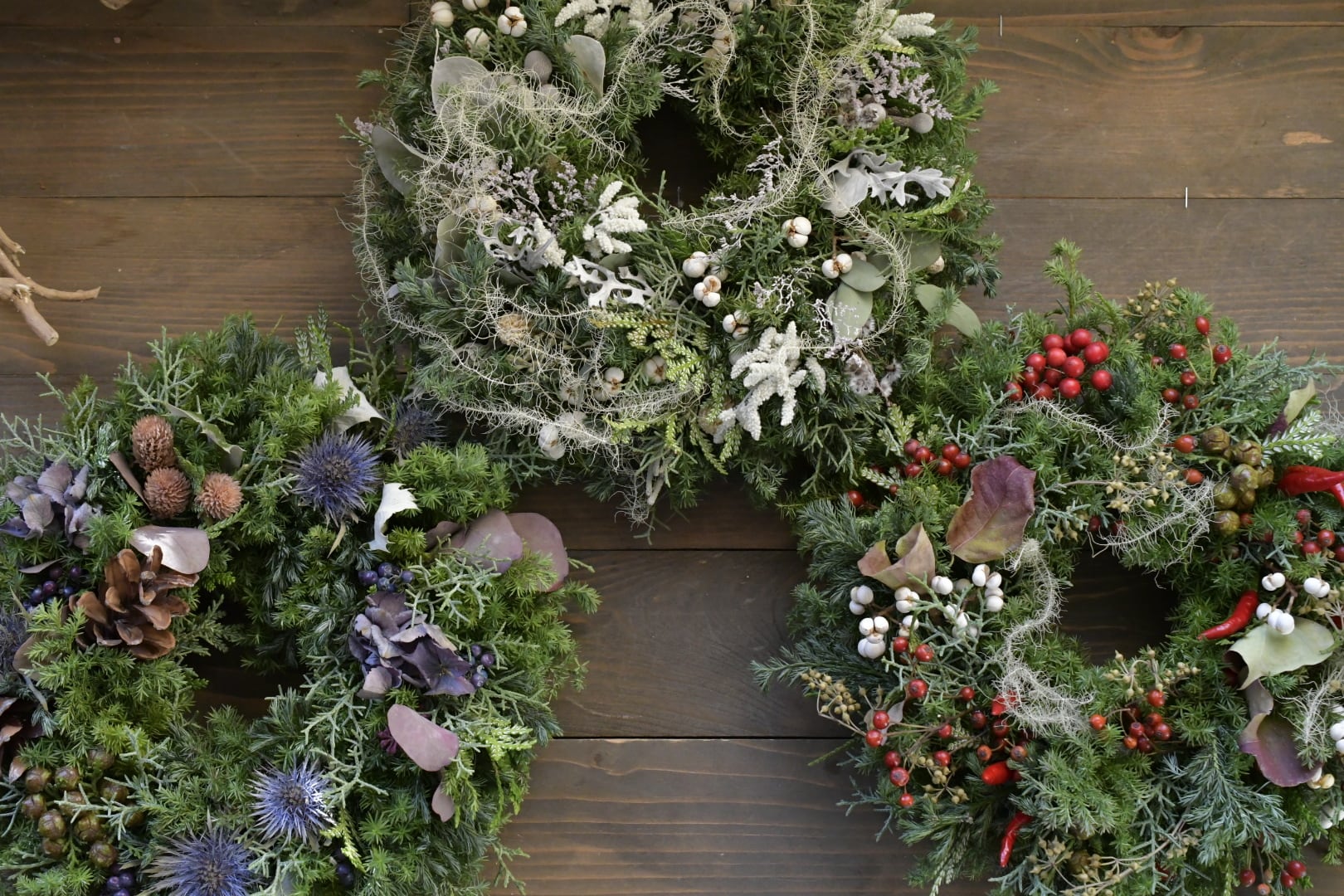 青系の花材を中心に乗せたクリスマスリースです。乾いてもボリュームを保てるように、たっぷりのグリーンを使って制作しております。この季節ならではの針葉樹の香りをお楽しみください。