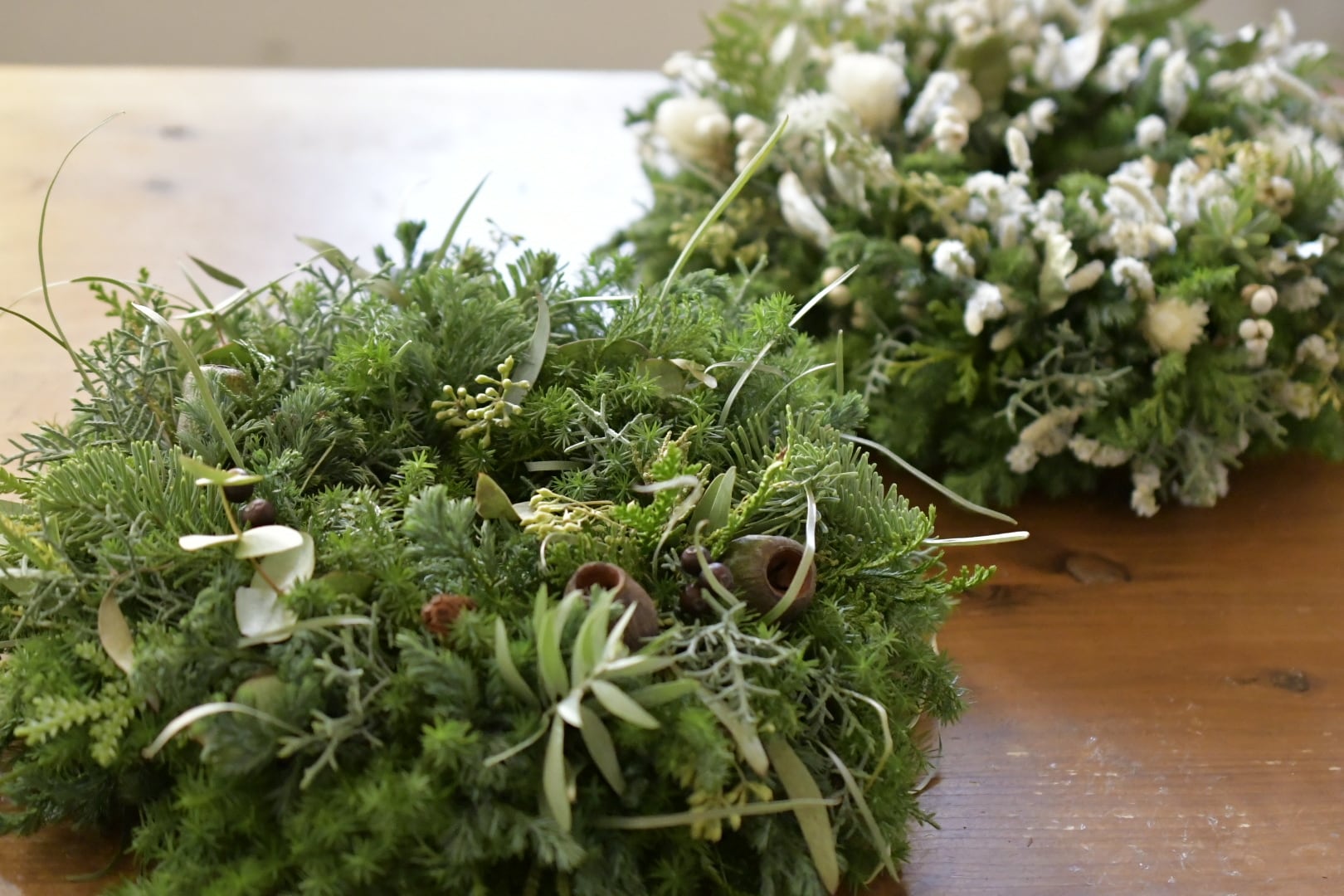 針葉樹と、いろいろな葉を紡いだグリーンだけのシンプルなクリスマスリースです。このままでももちろん可愛いけれど、ご自分で好きな花材足して作りたい方にもおすすめです。
