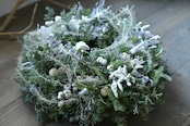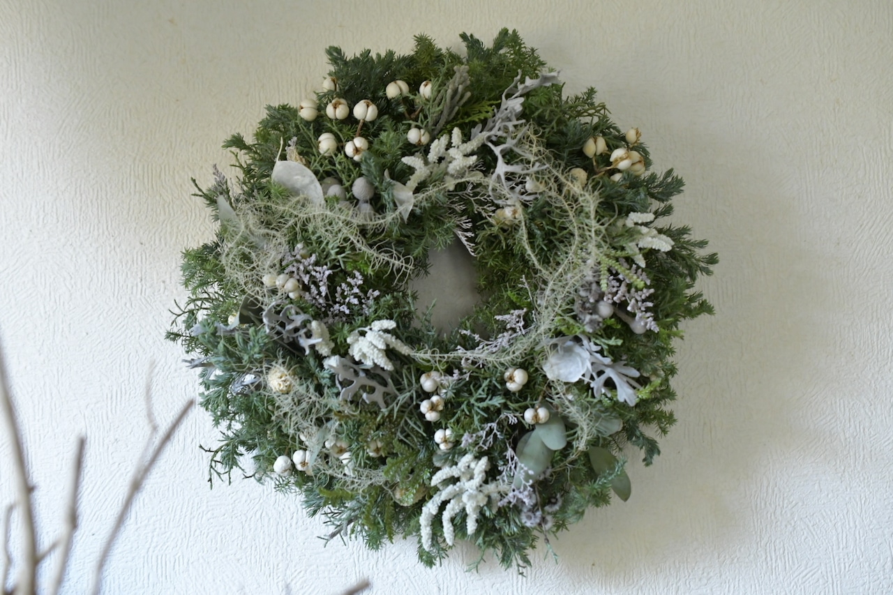 雪を乗せた針葉樹のように、白い花材をたっぷり使ったクリスマスリースです。(一部プリザーブドフラワー使用)